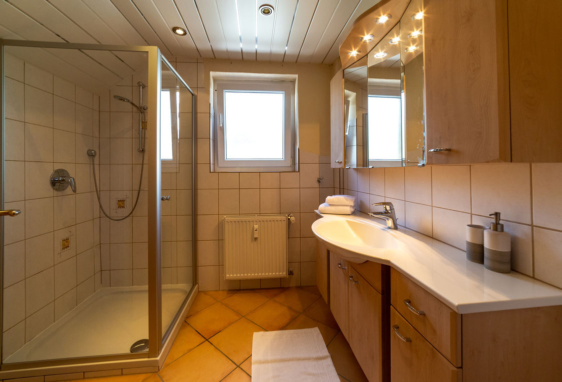 This apartment is located on the first floor of the Schneehaus. It has a spacious entrance area with plenty of room for your coats and shoes. The living room has a wooden parquet floor and a seating area with two comfortable chaise longues from where you can watch Satellite TV.
